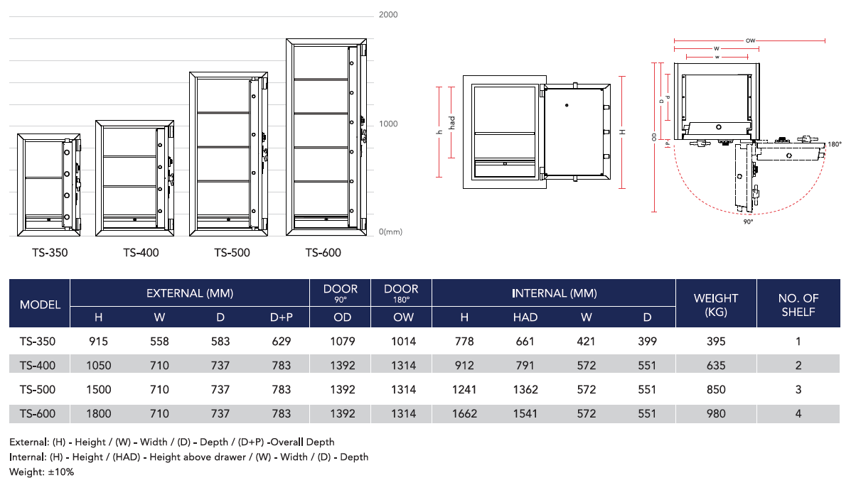 *External depth exclude handle, add 50mm to external depth for handle